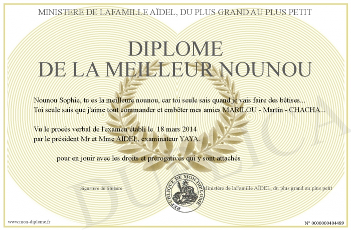 Envoyez par email votre Diplôme de La Meilleur NOUNOU personalisé