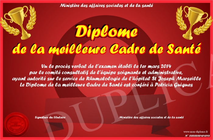 Envoyez par email votre Diplôme de la meilleure Cadre de Santé personalisé