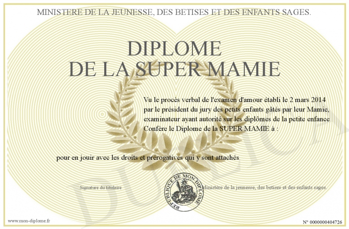 Envoyez par email votre Diplôme de la SUPER MAMIE personalisé