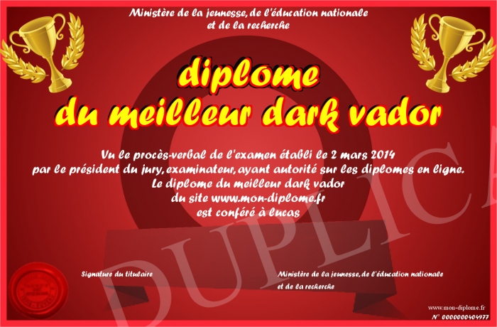 Envoyez par email votre diplome du meilleur dark vador personalisé