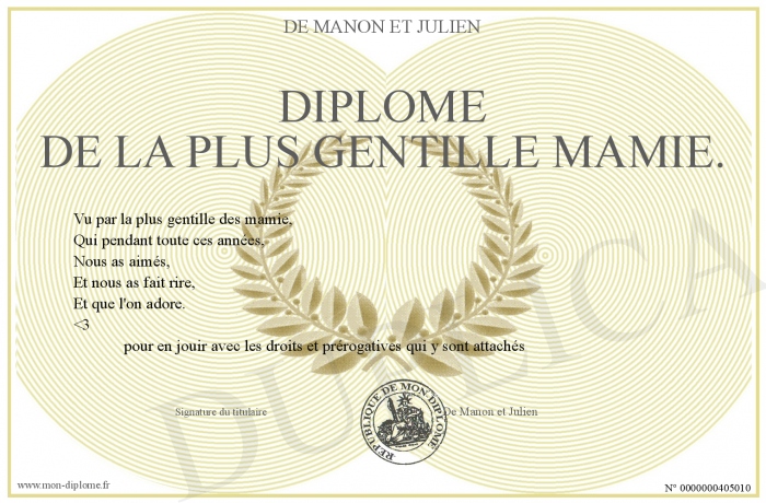 Envoyez par email votre Diplôme de la plus gentille mamie. personalisé