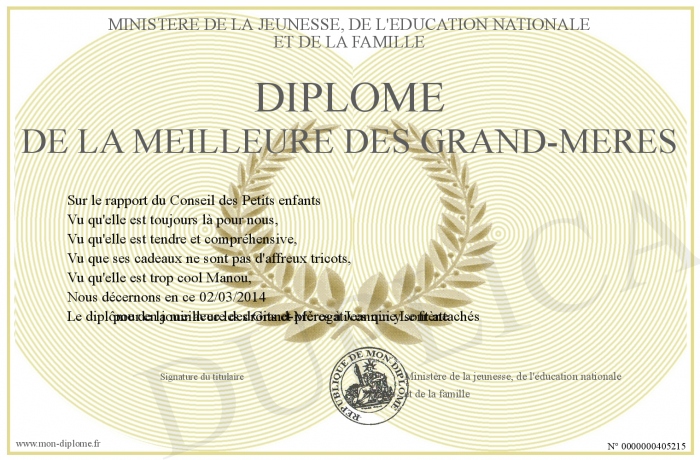 Envoyez par email votre Diplôme de la meilleure des grand-mères personalisé