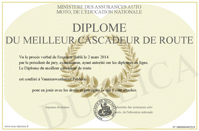 Envoyez par email votre Diplôme du meilleur cascadeur de route personalisé