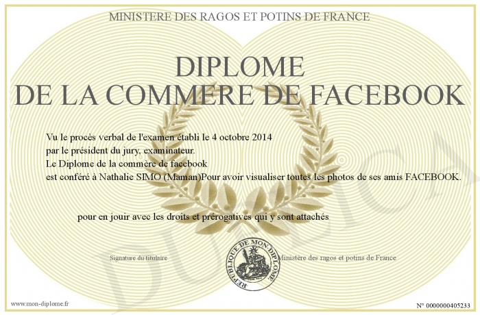 Envoyez par email votre Diplôme de la commère de facebook personalisé