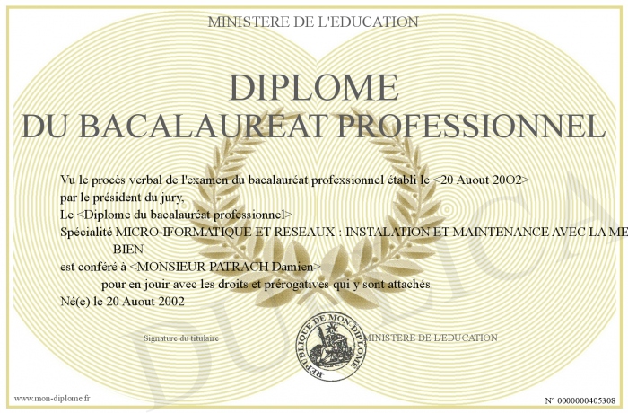 Envoyez par email votre DIPLOME DU BACALAUREAT PROFESSIONNEL personalisé