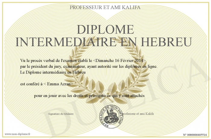 Envoyez par email votre Diplôme intermédiaire en Hébreu personalisé