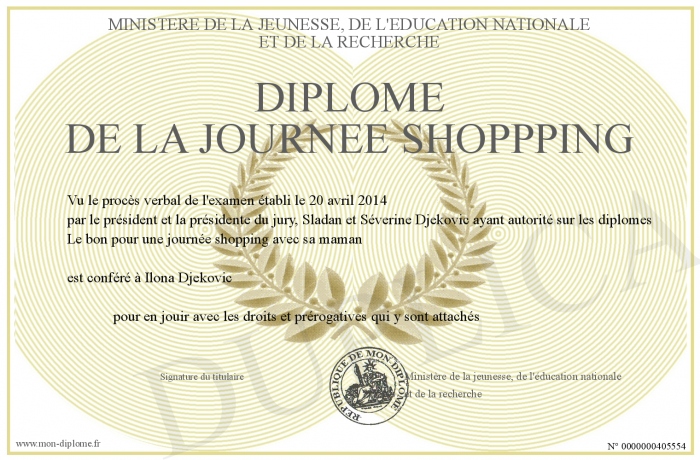 Envoyez par email votre diplôme de la journée shoppping personalisé