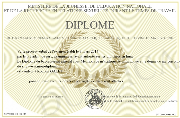 Envoyez par email votre Diplôme du baccalaureat général avec Mentions Je m'applique,Je m'implique et je donne de ma personne personalisé