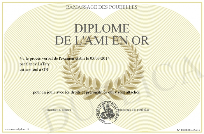Envoyez par email votre Diplôme de l'ami en OR personalisé