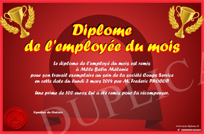 Envoyez par email votre Diplôme de l'employée du mois personalisé
