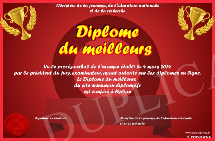 Envoyez par email votre Diplôme du meilleurs personalisé