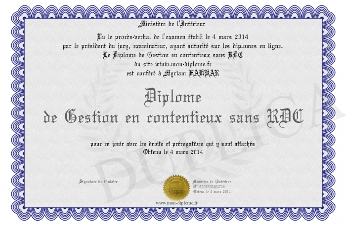 Envoyez par email votre Diplôme de Gestion en contentieux sans RDC personalisé