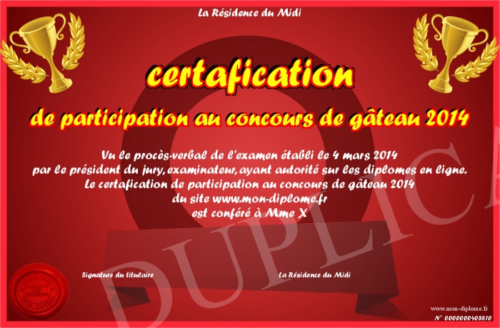 Envoyez par email votre certafication de participation au concours de gâteau 2014 personalisé