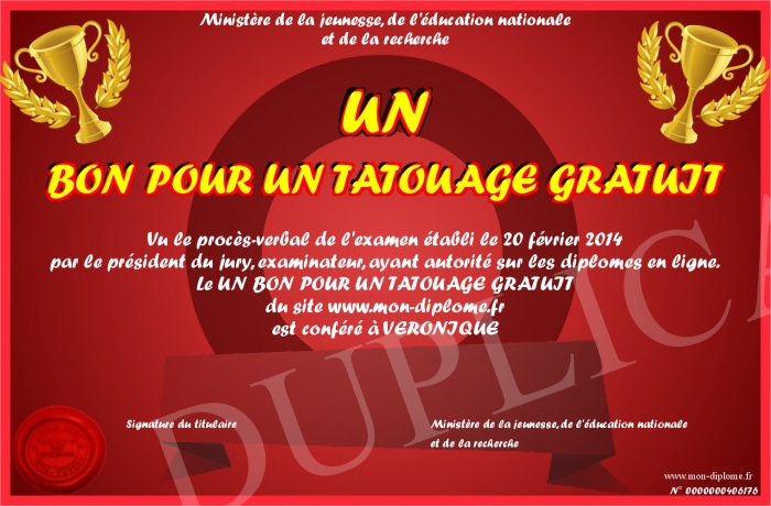 Envoyez par email votre UN BON POUR UN TATOUAGE GRATUIT personalisé