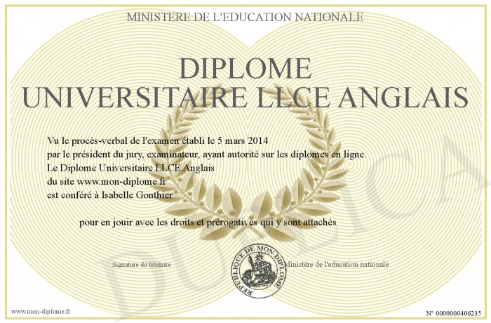 Envoyez par email votre Diplôme Universitaire LLCE Anglais personalisé