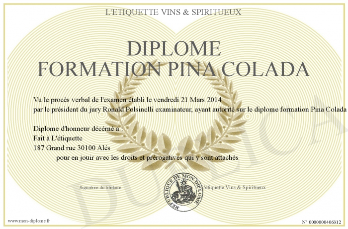 Envoyez par email votre Diplôme formation Pina colada personalisé