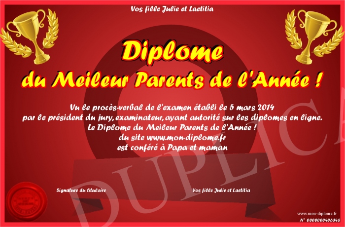 Envoyez par email votre Diplôme du Meileur Parents de l'Année ! personalisé