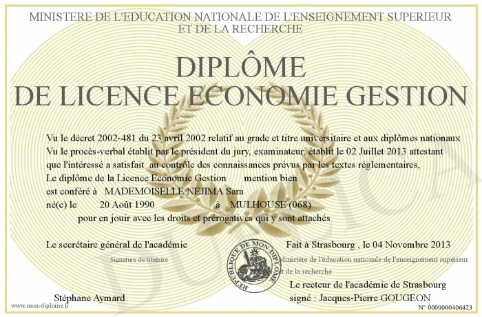 Envoyez par email votre DIPLÔME DE LICENCE ECONOMIE GESTION personalisé