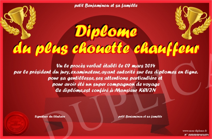 Envoyez par email votre Diplôme du plus chouette chauffeur personalisé