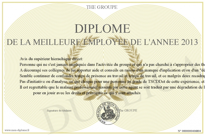 Envoyez par email votre Diplôme de la meilleure employée de l'année 2013 personalisé
