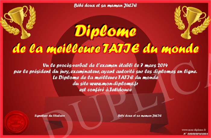 Envoyez par email votre Diplôme de la meilleure TATIE du monde personalisé