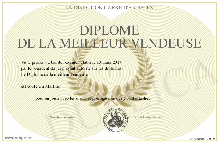 Envoyez par email votre Diplôme de la meilleur vendeuse personalisé