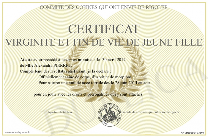Envoyez par email votre Certificat virginité et fin de vie de jeune fille personalisé