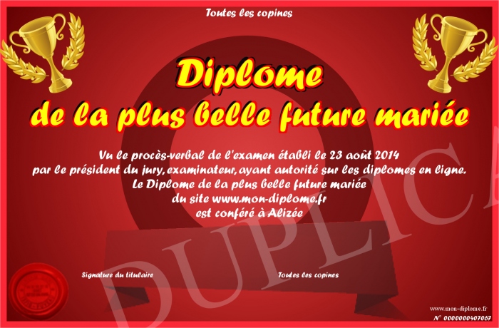 Envoyez par email votre Diplôme de la plus belle future mariée personalisé