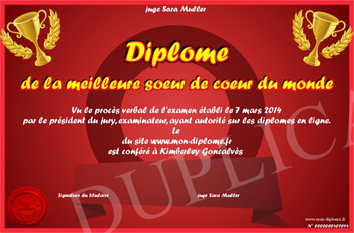 Envoyez par email votre Diplôme de la meilleure soeur de coeur du monde personalisé