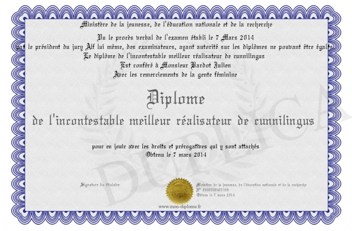 Envoyez par email votre Diplôme de l'incontestable meilleur réalisateur de cunnilingus personalisé