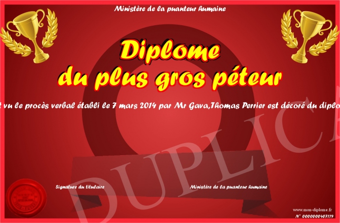 Envoyez par email votre Diplome du plus gros péteur personalisé