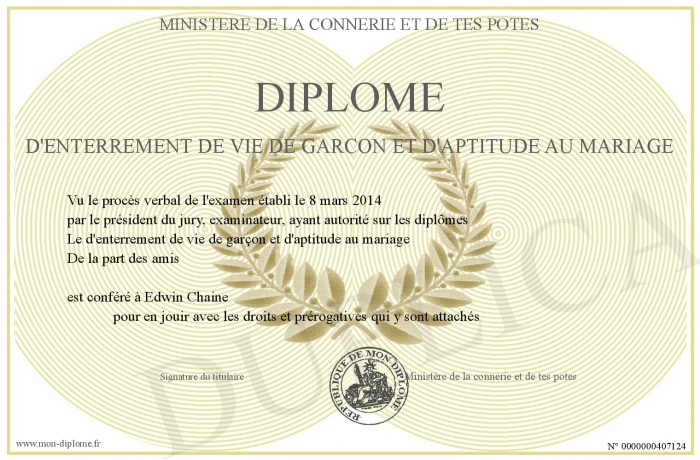 Envoyez par email votre DIPLOME D'ENTERREMENT DE VIE DE GARCON ET D'APTITUDE AU MARIAGE personalisé