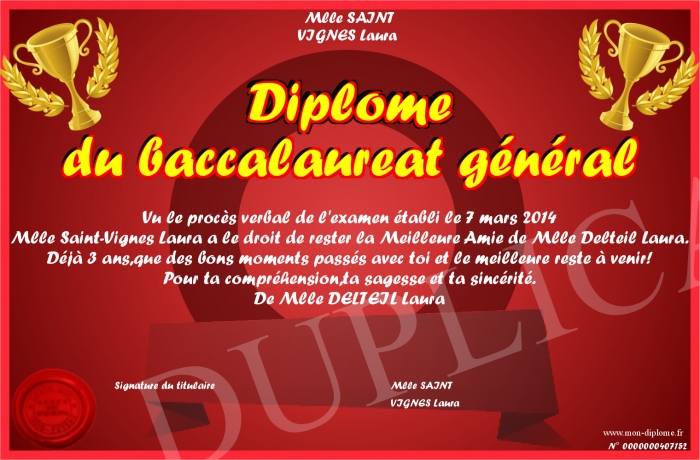 Envoyez par email votre Diplôme du baccalaureat général personalisé