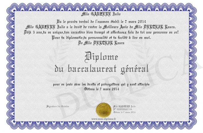 Envoyez par email votre Diplôme du baccalaureat général personalisé