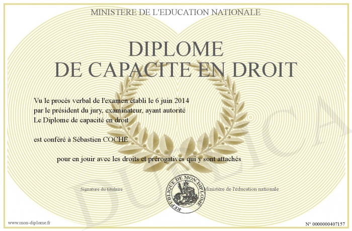 Envoyez par email votre Diplôme de capacité en droit personalisé
