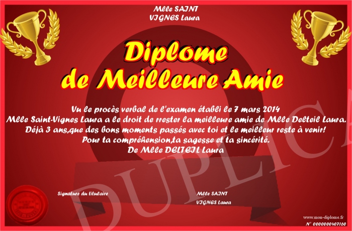Envoyez par email votre Diplôme de Meilleure Amie personalisé