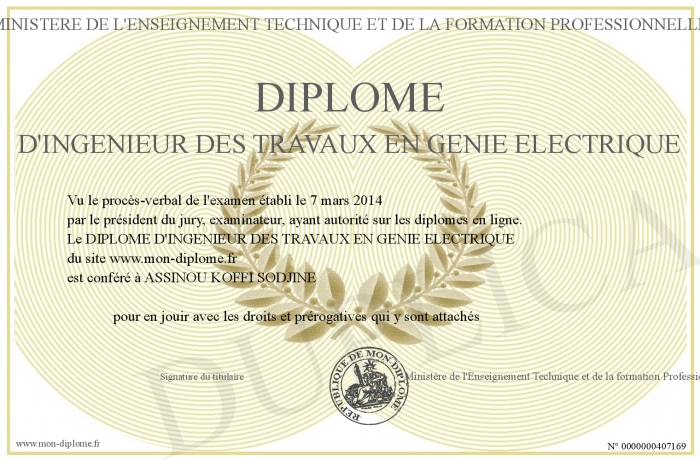 Envoyez par email votre DIPLOME D'INGENIEUR DES TRAVAUX EN GENIE ELECTRIQUE personalisé