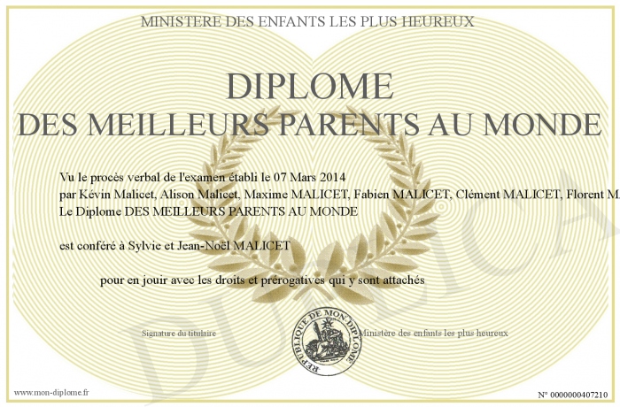 Envoyez par email votre Diplôme DES MEILLEURS PARENTS AU MONDE personalisé