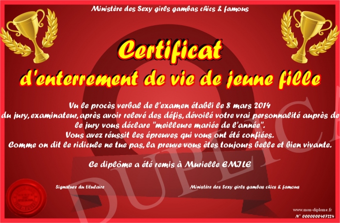 Envoyez par email votre Certificat d'enterrement de vie de jeune fille personalisé