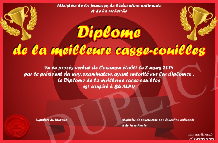 Envoyez par email votre Diplôme de la meilleure casse-couilles personalisé