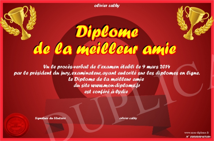 Envoyez par email votre Diplôme de la meilleur amie personalisé