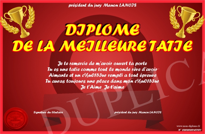 Envoyez par email votre DIPLOME DE LA MEILLEURE TATIE personalisé