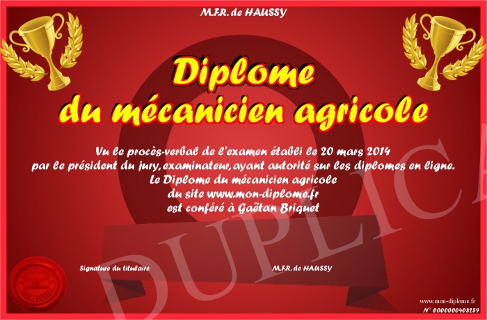 Envoyez par email votre Diplôme du mécanicien agricole personalisé