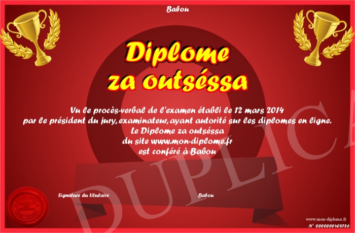 Envoyez par email votre Diplôme za outséssa personalisé