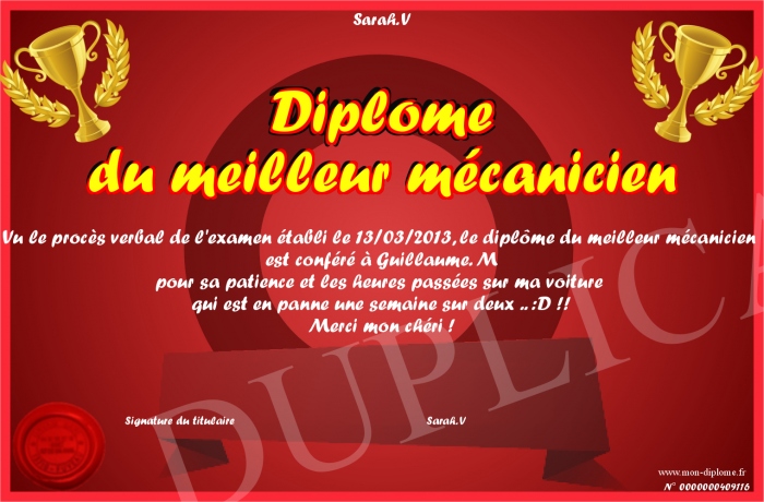 Envoyez par email votre Diplôme du meilleur mécanicien personalisé