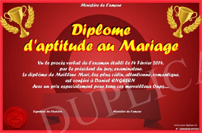 Envoyez par email votre Diplome d'aptitude au Mariage personalisé