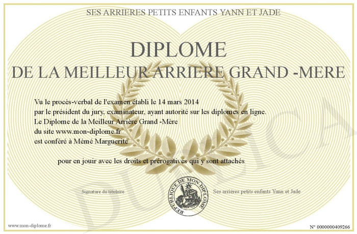 Envoyez par email votre Diplôme de la Meilleur Arrière Grand -Mère personalisé