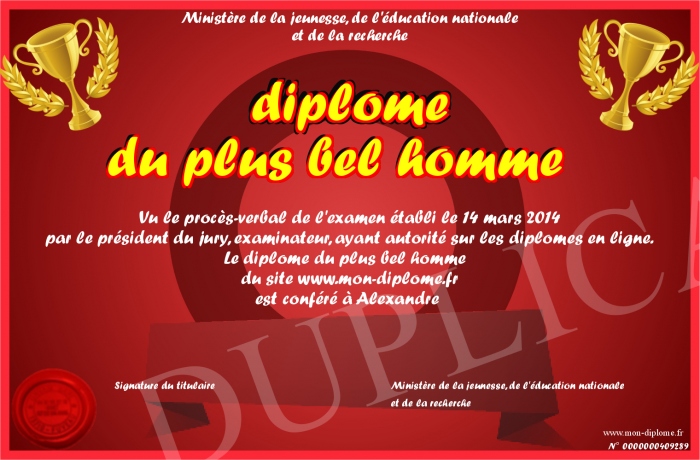 Envoyez par email votre diplôme du plus bel homme personalisé