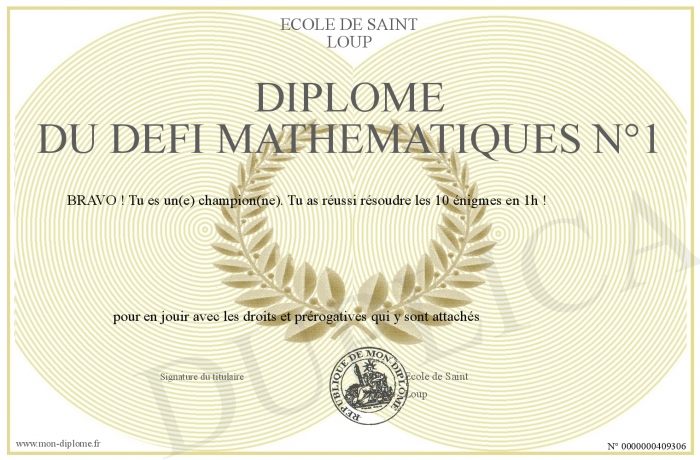 Envoyez par email votre Diplôme du défi mathématiques n°1 personalisé