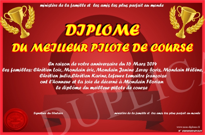 Envoyez par email votre DIPLOME DU MEILLEUR PILOTE DE COURSE personalisé